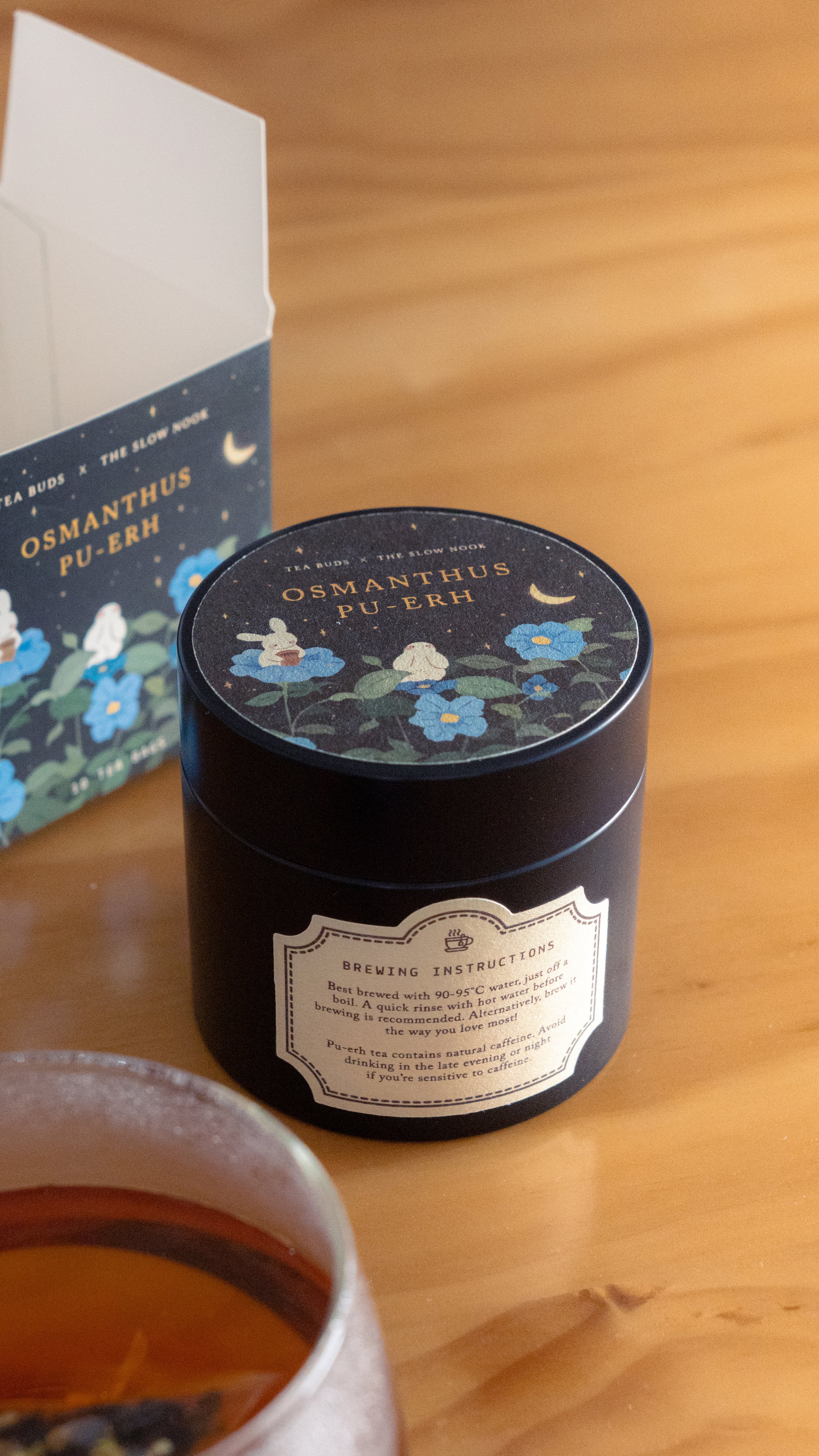In translating that into the packaging, I wanted to bring my own usual visual language and style into the story with soft, dreamy subjects. The illustration reflects both the depth of pu-erh and the gentle brightness of osmanthus, allowing the tea and its packaging to feel rooted yet luminous. I contributed to this collaboration by illustrating the main hero artwork, and subsequently planning and designing the various components of the packaging such as the main box, and label tin stickers.